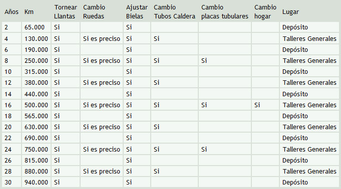 • Cada 50.000 kilómetros en el caso de locomotoras de mercancías, o 80.000 en el caso de locomotoras de pasajeros, una vez cada dos años más o menos, se tenía que efectuar una operación de "levante", para tornear las llantas de las ruedas, y ajustar el mecanismo de transmisión y distribución, operación esta última que venía impuesta dado que se tenían que desmontar las bielas para sacar los ejes. La duración de la operación podía ser de una semana o algo más.