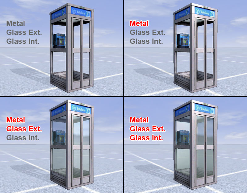 A modo de resumen, muestro juntas las cuatro fases de desarrollo de la cabina con la adición de los diferentes efectos de brillos en metal, cristales exteriores y cristales interiores, siempre desde una misma ubicación y ángulo de cámara, y a una misma hora del día: