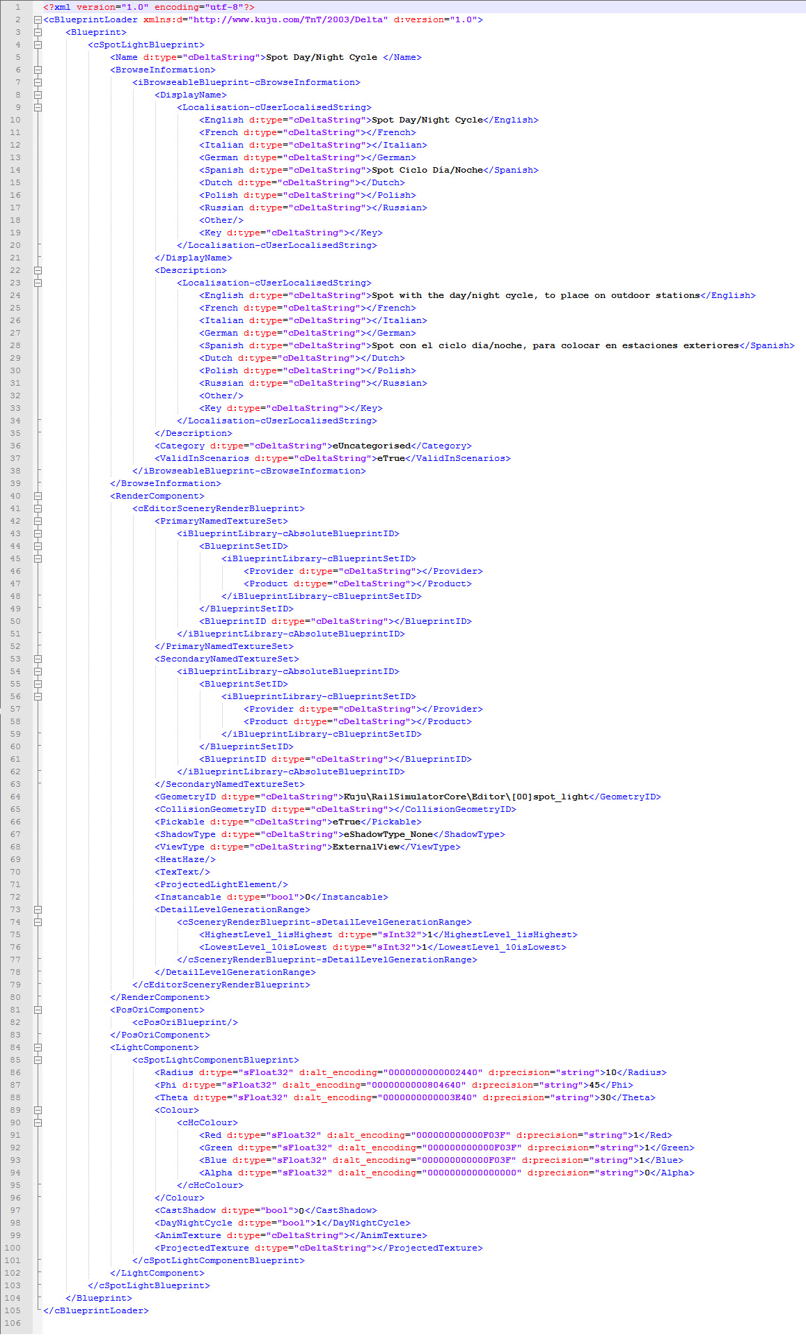 Interesantes conclusiones las que se están sacando en este hilo aunque el tema de desencudriñar el conjunto de luces originales del juego supongo que tendrá la finalidad de corregir las deficiencias/incongruencias que éstas presenten y no con la finalidad de utilizarlas en futuras rutas, ya que este segundo punto es mucho más sencillo de lo que pueda parecer leyendo el hilo. En el caso de luces para futuras rutas veo muchísimo más sencillo hacerlo vía blueprint editor, ya que se pueden crear estos productos desde el mismo al haber las correspondientes plantillas de spot y point lights. El blueprint es de lo más sencillo; tan sólo hay que darle un nombre, los valores que correspondan (radio/theta/phi..), determinar si ha de seguir el ciclo día/noche... El tema del color también es harto sencillo, ya que podemos introducir los valores RGB directamente en el blueprint editor pinchando sobre la barra de color en el desplegable que nos aparecerá y se encargará el solito de convertir estos valores. Lo único que necesitaremos será un child al que asociar el emisor de luz para poder manejarnos en el editor del simulador.