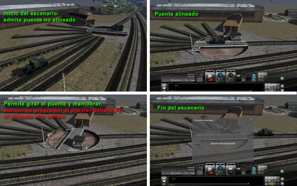 Al parecer hay un pequeño truco para poder realizar tales escenarios, que en su día me comentó Jordi Hernández, y consiste en que la posición del puente giratorio al inicio de la actividad no debe dar vía a la locomotora que conducimos, o mejor a ninguna vía si es possible. Me explico: