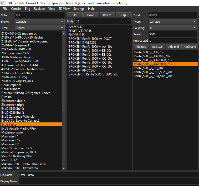 Uno de los conflictos que me daba al abrir una actividad era una 1900 + 20 tolvas, pues bien, en la carpeta de los consists incluidos en la ruta había otra 1900 diferente con 20 tolvas, así que he copiado ese consist a otra carpeta donde le he cambiado el nombre poniéndole el del consist faltante que se me pedía para poder abrir la actividad y, una vez cambiado el nombre lo he metido en la carpeta consist del juego, con lo cual esa actividad se ha abierto sin problemas.