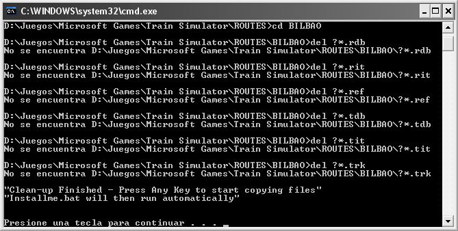 -2º.- Instalamos la actualización: hacemos doble clic en BILBAO_Patch.zip y extraemos en la carpeta ROUTES de Train Simulator; luego, dentro de la carpeta Routes de Train Simulator buscamos la carpeta BILBAO, la abrimos, buscamos el archivo UpdateMe.bat y lo ejecutamos, se nos abre una ventana tipo MS-DOS en la que nos dice que pulsemos una tecla para continuar (lo hacemos), y se nos abre otra ventana del mismo tipo, y cuando ya ha terminado de ejecutarse, cerramos ambas ventanas MS-DOS, y ya está instalada la actualización.