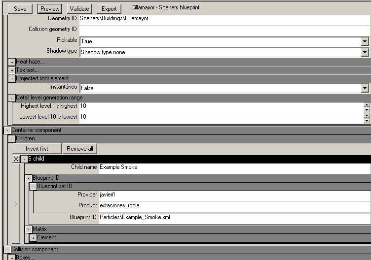 Abre el AssetEditor (en este caso como necesitamos el preview no nos sirve el blueprinteditor.exe). En el blueprint del edificio crea una entrada en Container component / children, conforme detallo en la captura, evidentemente poniendo tus datos de Provider y Product y variando la ruta si es otra. También lógicamente lo mejor es renombrar el humo para que no quede lo de example_smoke, etc. Evidentemente ese humo del ejemplo es muy feo y convendría modificarlo, pero esto no es excesivamente complicado.
