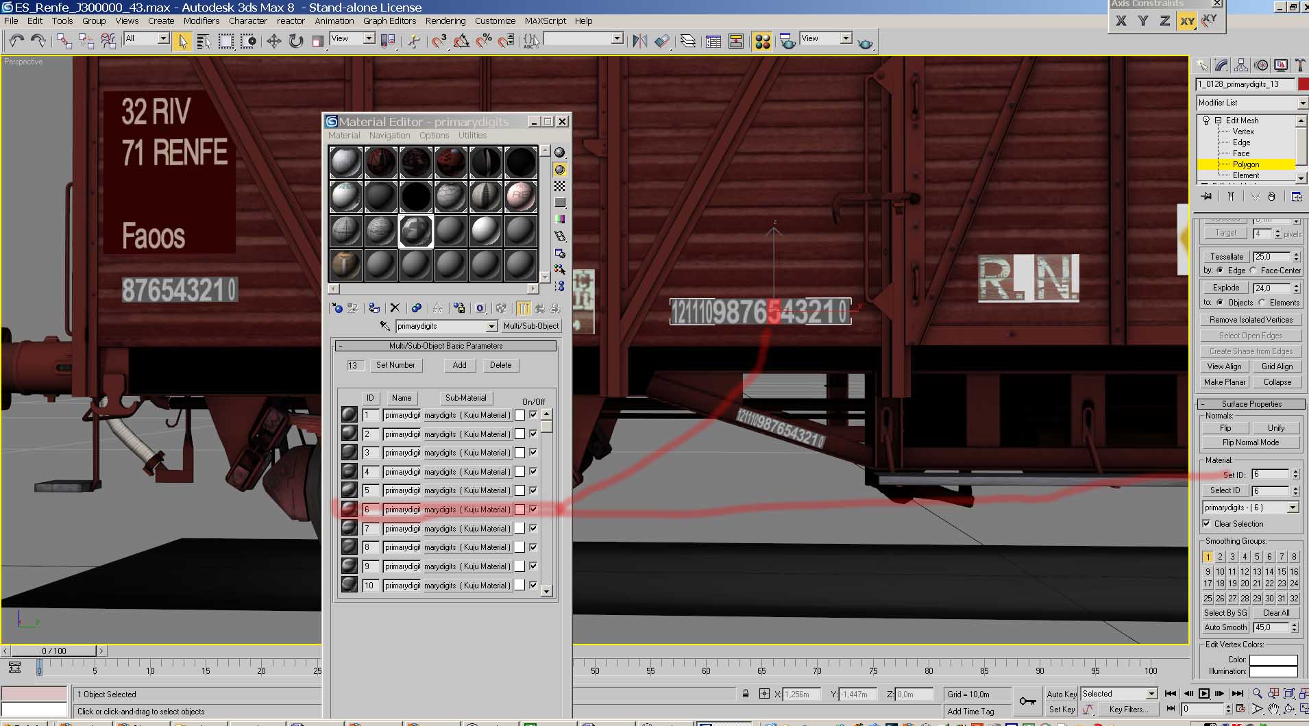 - Aplico a cada uno de los polígonos del plano que antes habíamos creado, cada uno de los ace como submateriales, empezando por la derecha con el 0 y acabando en la izquierda con el 12 (es decir que se verá 12, 11 10, 9,.... , 2, 1, 0). Observese que como el 0 corresponde a la ID 1 y el 11 a la ID 12, el 5 corresponde a la ID 6... Es un poco lío esto pero así lo hicieron los de Kuju por alguna razón (o sin ella) y lo he dejado para no experimentar más. Ver captura.