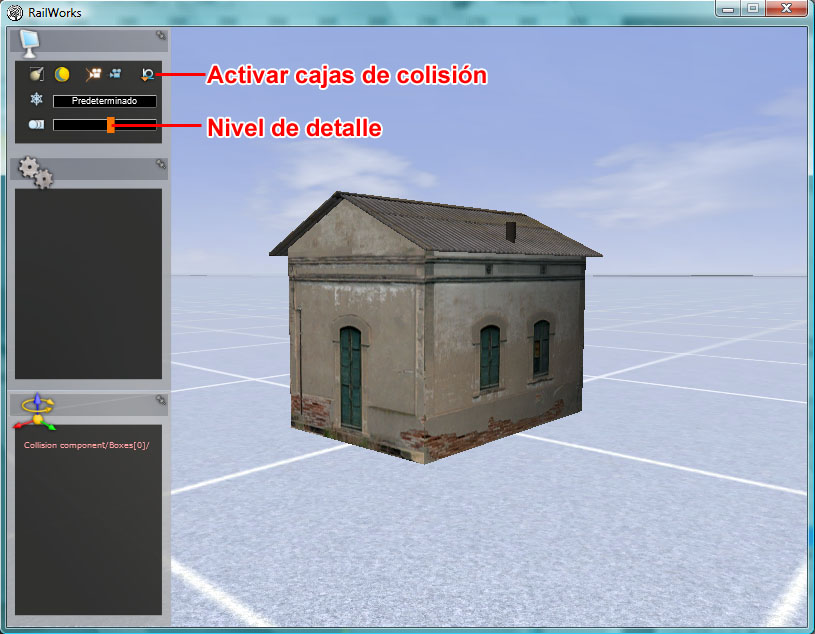 Podemos mostrar u ocultar la "Collision Box" (luego lo vemos) pulsando repetidamente en el icono "Activar cajas de colisión". En esta previsualización podemos comprobar de forma sencilla cómo actuará el simulador con los LODs según la distancia a la cual se encuentre la cámara. Bastará desplazar la barra "Nivel de detalle" para que apreciemos como los diferentes nodos del modelo se visualizan en la distancia:
