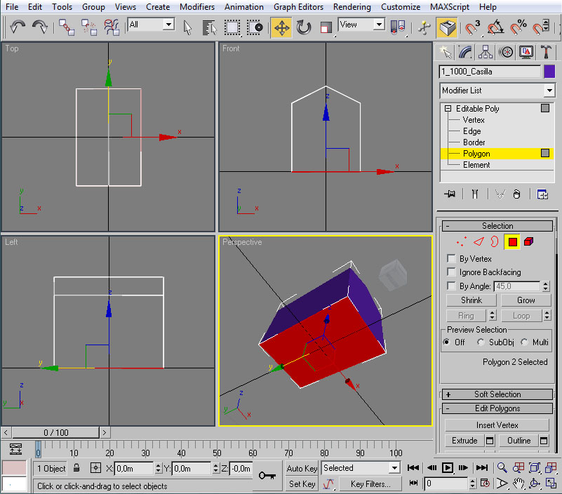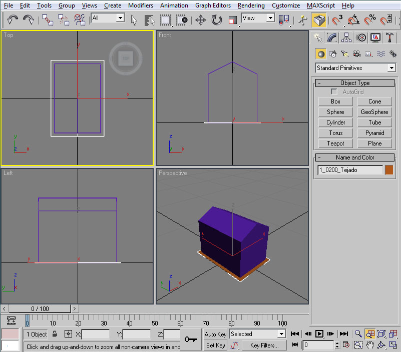 Con esto ya tenemos preparado el material para nuestra casilla, con su textura y su configuración de iluminación. Ahora la pregunta que nos surge es ¿cómo le aplico el material al modelo? En primer lugar deberemos tener seleccionado el/los elemento/s a los cuales vamos a asignar dicho material. Como en nuestro caso serán todos los objetos de la casilla nos bastará seleccionarlos con "Control" + "A". Un vez realizado esto tendremos varias maneras (como suele ser común en 3ds por lo que vamos viendo) de llevar a cabo la asignación: