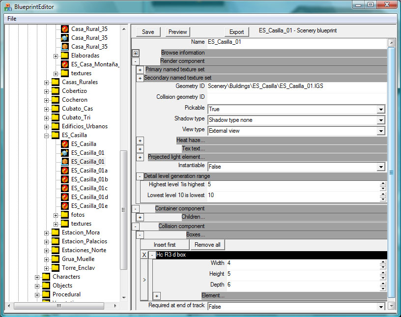 Ante todo se nos preguntará por el "tipo" de blueprint que queremos crear. Elegiremos un "Scenery blueprint", que es el apropiado para nuestra casilla, y en general para todo tipo de objetos escénicos. Antes de que nos olvidemos, le cambiaremos el nombre al archivo creado por uno que nos indique su contenido, por ejemplo "ES_Casilla_01", y podremos proceder a ir cumplimentando los campos del blueprint que nos interesen: