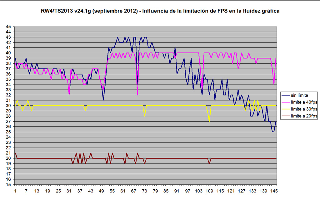En rw3/ts2013 el mínimo de jugabilidad lo propongo a 20, ya que el "core" gráfico está más optimizado (casi todo el mundo puede subir un nivel en antialiasing, rutas injugables puedes ser ahora jugables, etc).